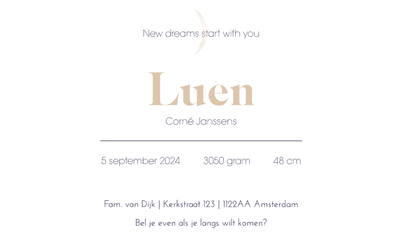 Op deze pagina kun je jouw eigen poster op maat aanvragen, handgemaakt met aquarelverf, bladmetaal of andere materialen naar wens. Elk ontwerp is uniek en volledig afgestemd op jouw persoonlijke stijl. Wil je een poster in de stijl van een geboortekaartje of trouwkaart? Upload deze dan eenvoudig via het formulier hieronder en de poster wordt gemaakt in de stijl van het geboortekaartje met het bijbehorende lettertype.